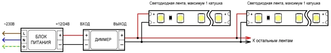 • Мощность подключаемой ленты больше мощности диммера;