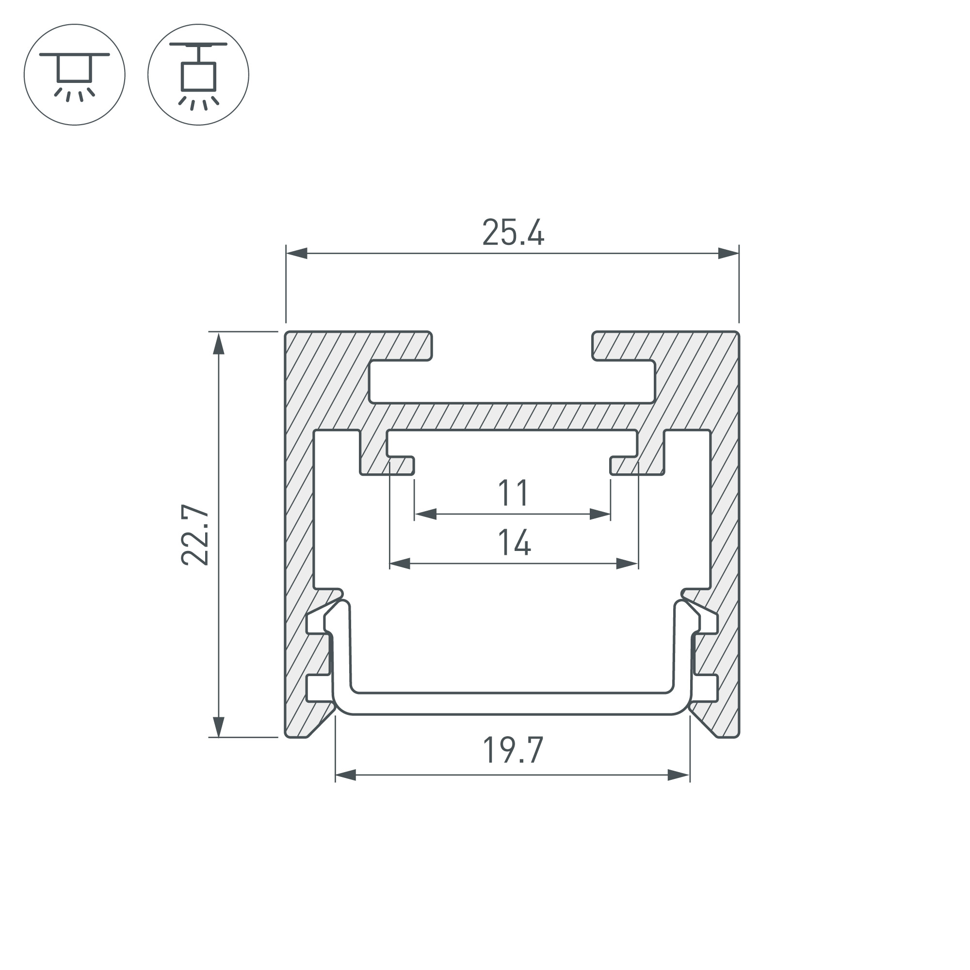 Подвесной/накладной профиль черного цвета из алюминия для основного освещения и контурной подсветки. Габаритные размеры профиля составляют 2500 мм в длину, 25,4 мм в ширину и 22,7 мм в высоту. Площадки для установки светодиодных лент позволяют использовать ленты шириной до 12 мм и мощностью до 25 Вт/м. Это обеспечивает гибкость в выборе светодиодных лент и создает потрясающие световые решения. Экраны, заглушки и другие аксессуары не включены в комплект и приобретаются отдельно. Цена указана за 1 метр профиля. Отличное решение для создания современных световых проектов.