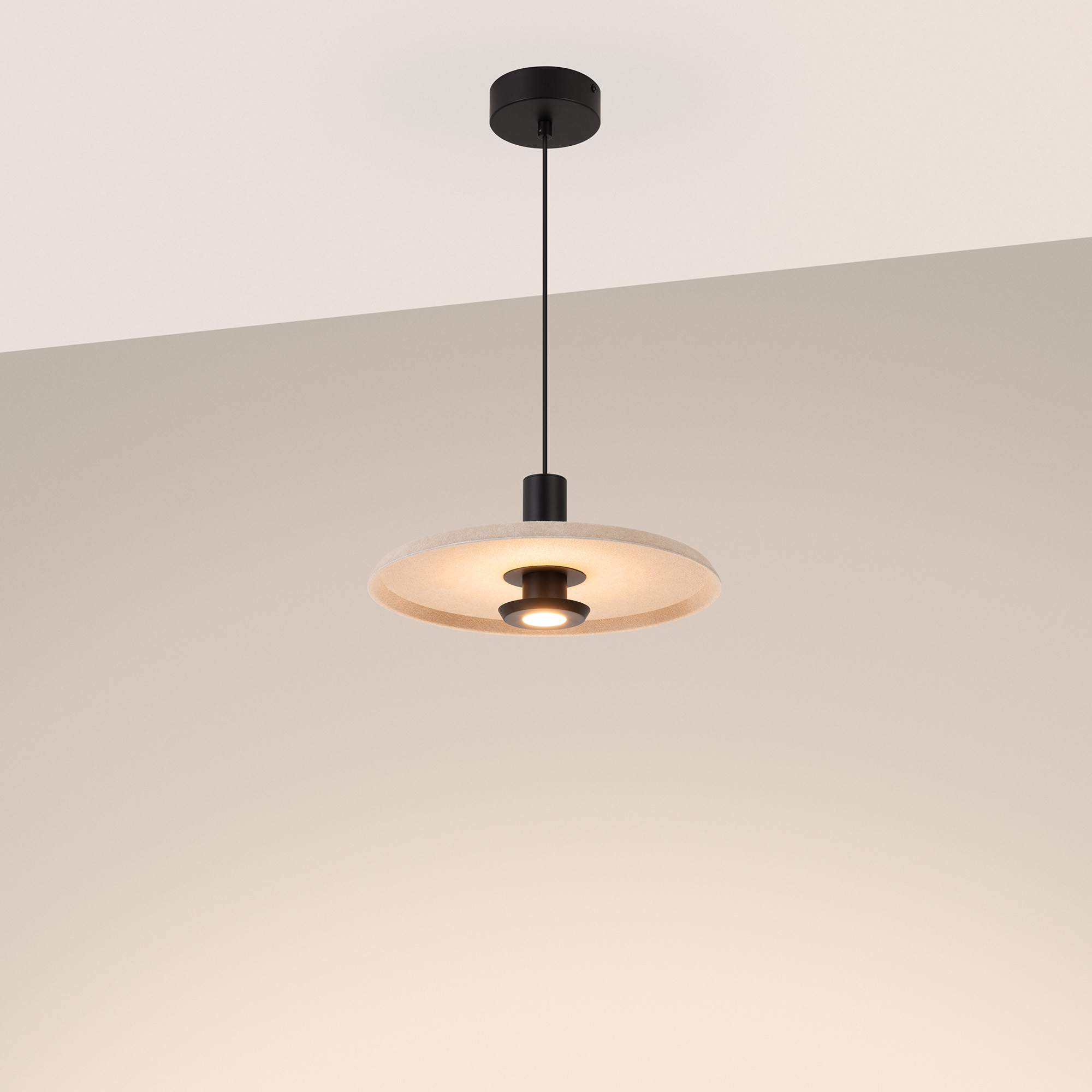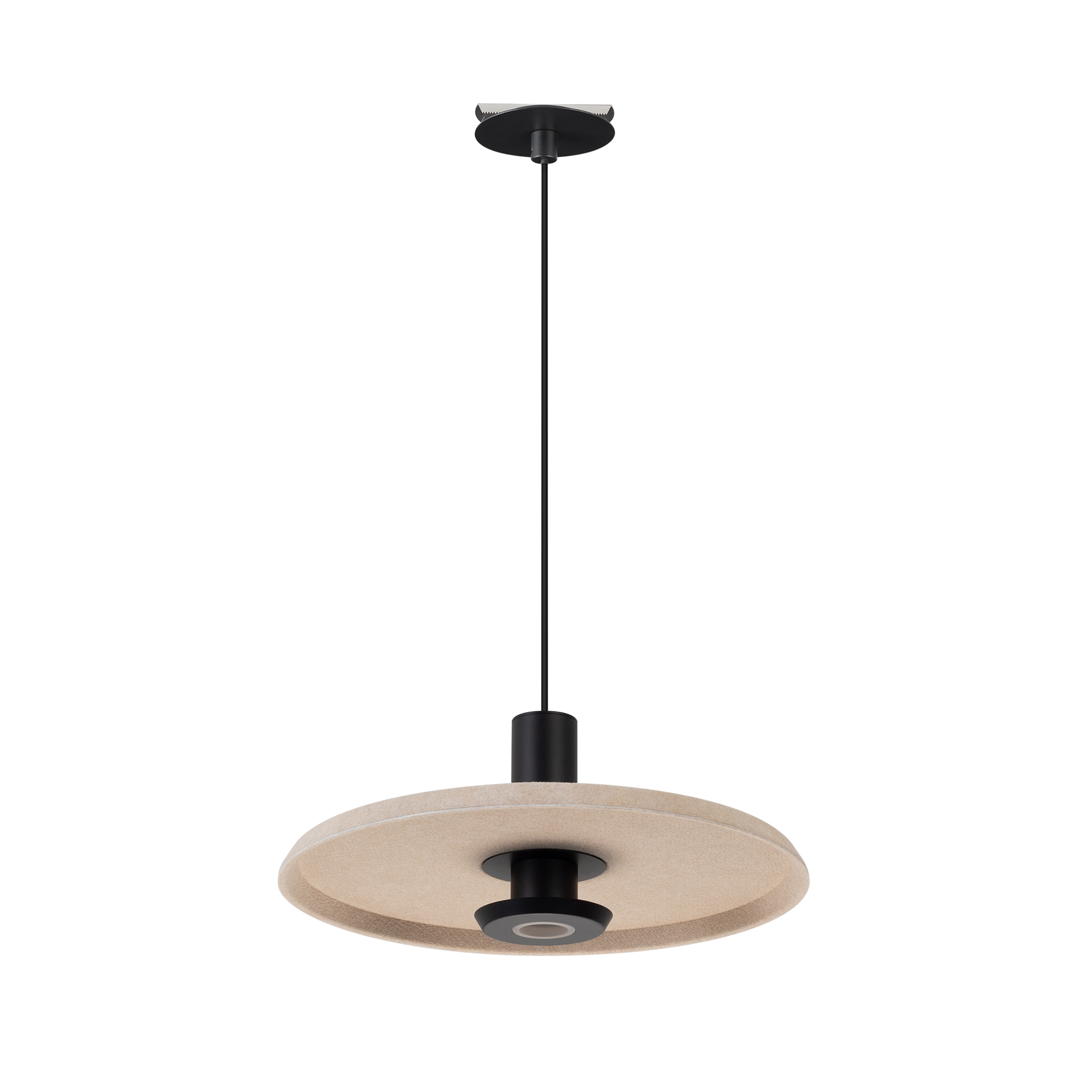 Подвесной светильник. Мощность 12 Вт, св. поток 708 лм, 59 лм/Вт, теплый 3000 K, CRI>94, угол 36°, напряжение питания 230 В. Бежевый фигурный корпус из переработанного фетра с бежевой внутренней поверхностью, линза-рассеиватель из PMMA, степень защиты IP20. Размер: диаметр 350 мм, высота 145 мм. Монтаж подвесной, длина подвеса 2000 мм, регулируемая. В комплекте 2 вида чаш. Габариты чаши (встраиваемая) Ø80 х 23 мм, врезное отверстие Ø60 мм. Габариты чаши (накладная) Ø120 x 35 мм. Драйвер 59 В, 300 мА, пульсация <1%. Управление по TRIAC.